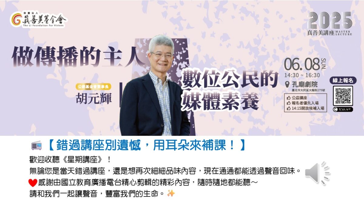 【錄影放送】真善美講座 時間│114/6/8(週日) 下午2:30-4:306 講題│做傳播的主人─數位公民的媒體素養 主講│胡元輝 / 公視基金會董事長、中華電視股份有限公司董事長 地點│臺北孔廟劇院(台北市大同區大龍街275號)