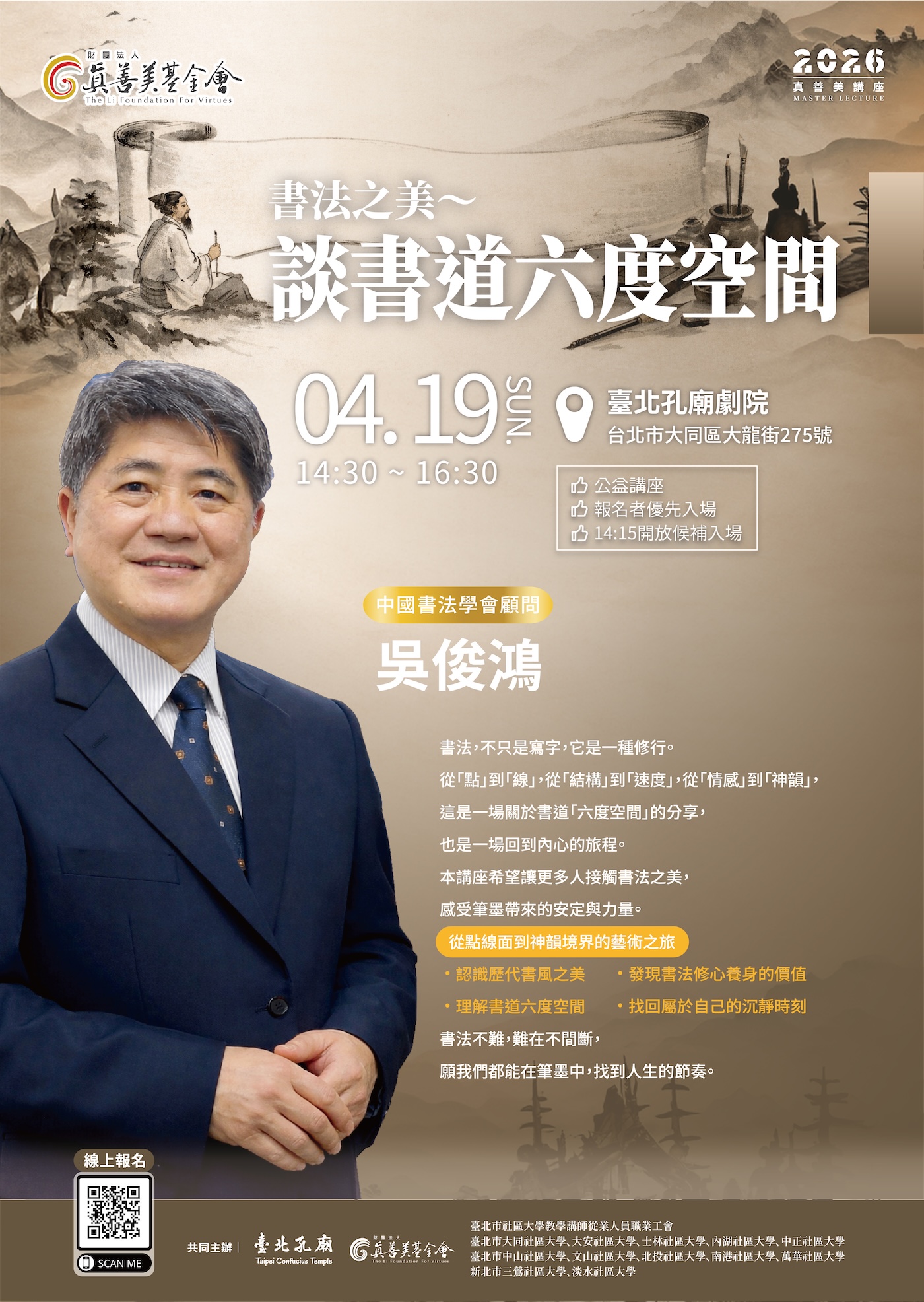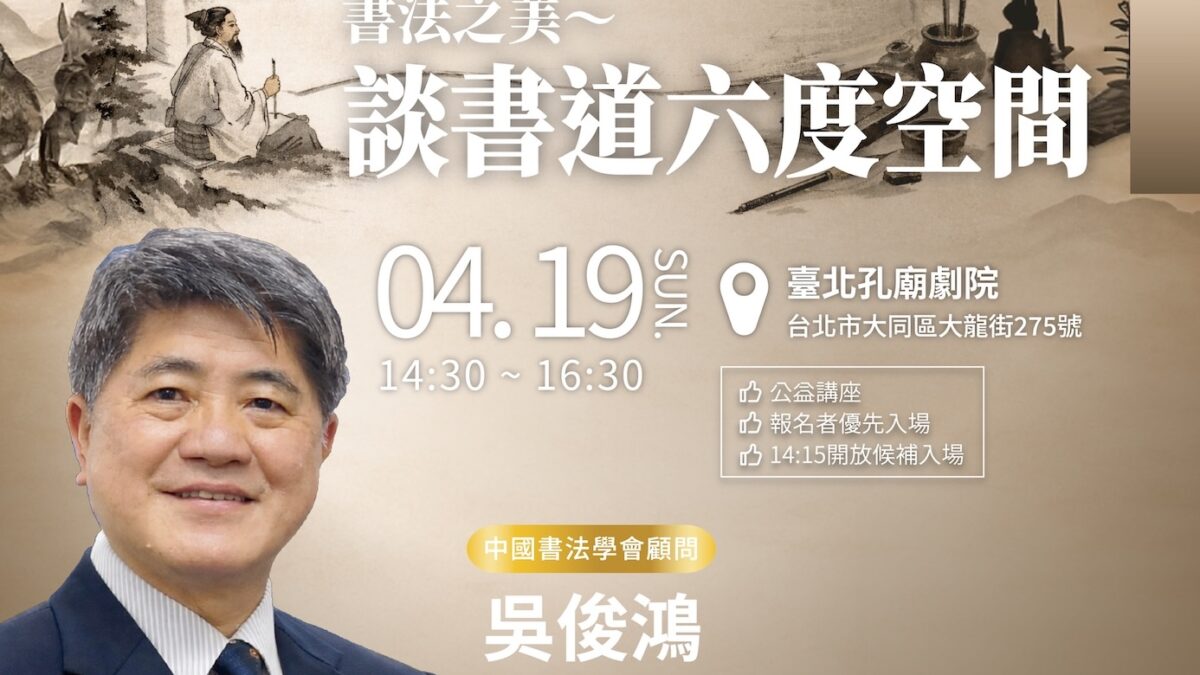 這不只是一場講座,更是一次心靈的修煉。本場講座將由吳俊鴻老師帶領您領略書法如何與音樂、舞蹈、氣功跨界共鳴,讓墨香融入呼吸,用筆尖豐富人生。